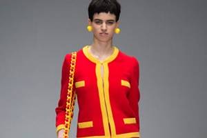 MOSCHINO There is always a sense of humour in any Moschino collection, but with Jeremy Scott as its new creative director, there was no question this show was going to veer away from anything ordinary. The opening look is best decribed as a cartoon version of Chanel, a bright and brash two piece wool jacket and skirt, but in fire-engine red and canary yellow. Even the clip-on earrings and two-tone shoes were mimicked. Chanel iconography was a theme throughout the collection, as was candy-shop chic, like dresses in chocolate wrappers or crisp prints. Perhaps these were a little too sweet.