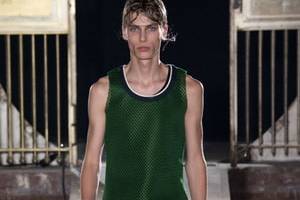 Lightweight minimalist looks of relaxed jackets and zip-up shirts opened the show at Christophe Lemaire, with covetable field jackets worn with rolled up sleeves. Most looks were monochrome, in white, black or navy, focusing on unstructured tailoring with relaxed, though not oversized, silhouettes. Key items included two, four and eight-button double-breasted blazers, layered over baseball shirts and worn with relaxed trousers.