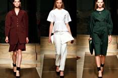 This time the London-based designer chose to accentuate volume, silhouette and shape: last season's linear trousers came more fluid and roomy. Billowing sleeves and sculpted shoulders found their way on jackets and were accentuated with wide, minimal belts on waists and kept the look lean. Peplum fluted along the waist added to trousers, just as Watteau backs of blouses.