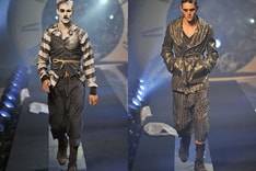 The silhouette focused on a mix of oversized and undersized, Galliano opened with a passage dedicated to Chaplin's style, reworking proportion and tailoring. He turned the Little Tramp's iconic baggy trousers into dropped-crotch pants, either full and long or cropped at the calf, and topped with shrunken blazers or trench coats, both belted at the waist. Then the designer paid homage to the tailored Keaton with a series of pale suits worn with wing-collared shirts. Other key pieces included the fluid but straight-cut pants and the high-breaking overcoats.