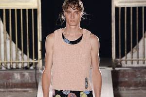 Long denim shirts, layered tank tops showing off bulging biceps and tattoos and jackets with ID badge prints were teamed with narrow trousers and sneakers with flashing LEDs.Models with long, brushed-forward fringes and long wisps moved about robot-like, starring straight ahead with dead eyes.