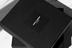 The new Saint Laurent logo is pictured with two black boxes placed upon a marble tabletop. As previously reported, the font depicts clean, modern lines and is printed in white against a black background. The simplicity brings to the fore the font's beauty and is much more like the label's 1966 lettering than the swirly Yves Saint Laurent typography of recent years.